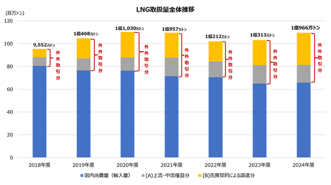 図:2018年度から2024年度における日本企業のLNG取扱量全体推移