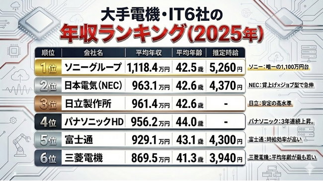 【大手電機・IT6社】年収×残業分析(2025年)|平均年収966万円、残業は開示企業で20.2~23.7時間