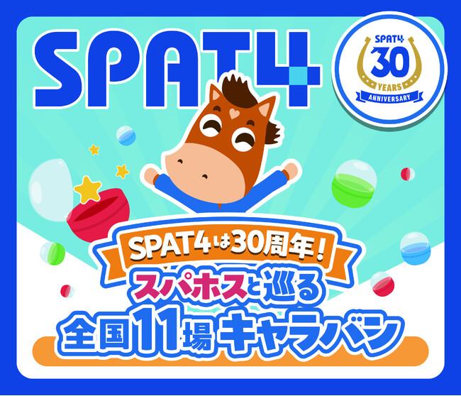 これに伴い、株式会社eパドックは2026年2月より、全国地方競馬11場(帯広・門別・盛岡・水沢・金沢・笠松・名古屋・園田・姫路・高知・佐賀)にて、リアルイベント「SPAT4は30周年!スパホスと巡る全国11場キャラバン~地方競馬場キャラクターの限定コラボグッズがガチャで当たる~」の開催を発表いたします。