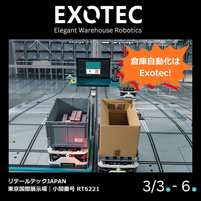 Exotec SAS(本社:フランス・クロワ市、CEO:ロマン・ムーラン)の100%子会社であるExotec Nihon株式会社(東京都港区、代表取締役 アジアパシフィック地域社長:立脇 竜、以下Exotec)は、2026年3月3日(火)より東京ビッグサイトで開催される国内最大級の流通業向け情報システム総合展「リテールテックJAPAN 2026」に出展することをお知らせします。