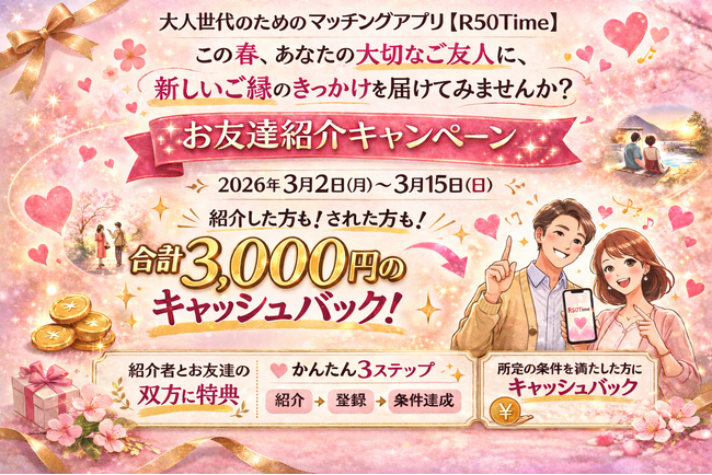 株式会社ソーシャルサービス(本社:東京都千代田区、代表取締役:白形 知津江、以下「当社」)は、大人世代のためのマッチングアプリ『R50Time』において、より安心して新しい出会いを始めていただくことを目的に、既存会員からの紹介を通じて参加できる「お友達紹介キャンペーン」を実施いたします。