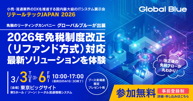 免税システムの世界的リーディングカンパニーであるグローバルブルー・ティエフエス・ジャパン株式会社(本社:東京都千代田区、代表取締役:清水克俊、以下「グローバルブルー」)は、2026年3月3日(火)から6日(金)まで東京ビッグサイトで開催される「リテールテックJAPAN 2026」に出展します。