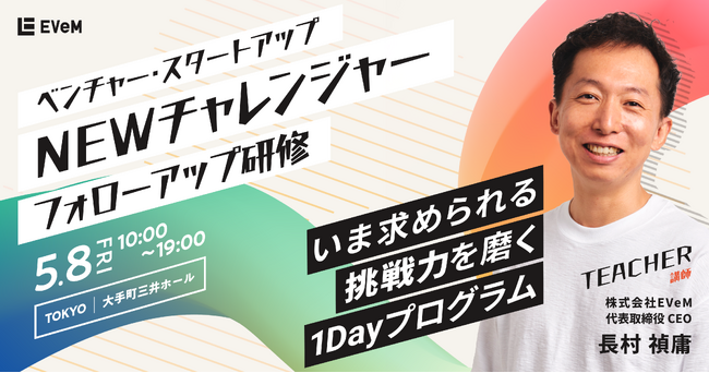 株式会社EVeM(本社:東京都新宿区、代表取締役CEO:長村 禎庸)は、ベンチャー・スタートアップ企業の入社1~3年目の若手社員を対象とした、「NEWチャレンジャー」フォローアップ研修を、2026年5月8日(金)に開催いたします。複数社の若手社員が一堂に会し、スタートアップ環境で成果を出すために必要なビジネスマインドを学ぶとともに、ワークや交流を通じて日々の業務に活かせる形で実践的に身につけていきます。昨年実施した本研修が大変好評を博したことを受け、今年は会場を拡大し、より多くの参加者を迎えて開催いたします。