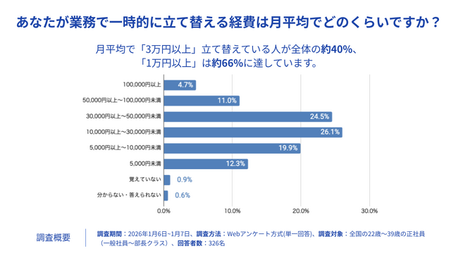[画像1: https://prcdn.freetls.fastly.net/release_image/6428/2023/6428-2023-1cff26561d28d48b63f6129b1168e6d3-1280x720.png?width=536&quality=85%2C75&format=jpeg&auto=webp&fit=bounds&bg-color=fff ]「あなたが業務で一時的に立て替える経費は、月平均どのくらいですか」という質問に対して、月平均「1万円以上」の回答が約65%を上回り、「3万円以上」の回答も約40%以上ありました。