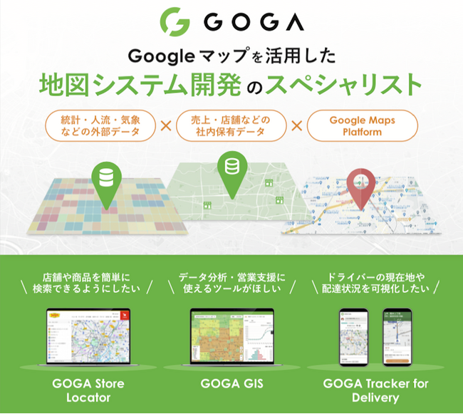 「店舗検索システム GOGA Store Locator」は、Google マップ を活用した店舗検索機能と、直感的な管理画面をセットで提供し、顧客体験の向上と企業の業務効率化を同時に実現します。