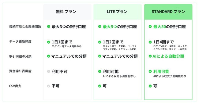 無料プランは、財務管理をこれから始める中小企業・個人事業主の方に最適な設計となっています。一方で、複数口座を横断した資金管理や、AIによる自動分類・将来予測機能を活用し、より高度な経営判断を行いたい企業には、有料プラン(LITE/STANDARD)をご用意しています。無料プランと有料プラン(LITE/STANDARD)の主な違いは以下の通りです。