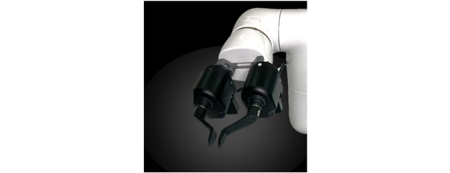 独自に開発した「バラ積みを“まさぐりながら”つかむ」を実現する新しいロボットハンド。これまでカメラでの画像認識など、高額になりやすいシステムを必要としてきたモノのピッキングを、柔軟な関節と、3次元の変位計測が可能な近接覚センサーを組み合わせることで、カメラだけに頼らず対象物の形に合わせてつまみ上げることを可能にし、自動化システムのトータルコスト低減にも貢献します。