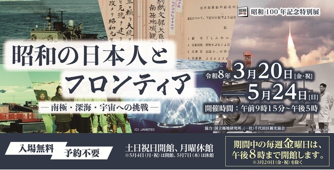 独立行政法人国立公文書館(所在地:東京都千代田区、館長:鎌田 薫)は、令和8年3月20日(金・祝)~5月24日(日)の間、令和8年春の特別展 昭和100年記念特別展「昭和の日本人とフロンティア―南極・深海・宇宙への挑戦―」を開催いたします。
