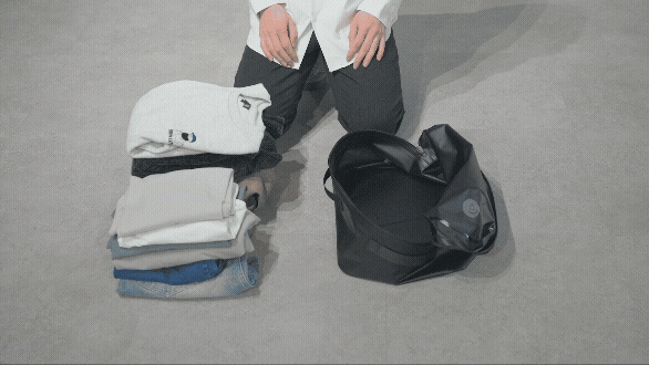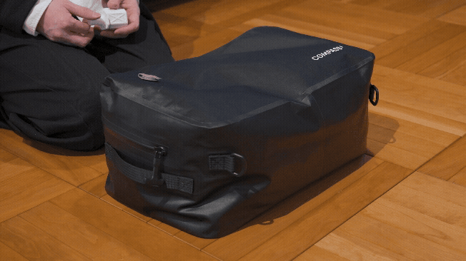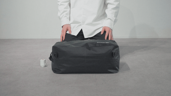 驚くほど身軽になれる「引き算の設計」です。バッグから余計な重り(電動ポンプ内蔵)をなくしたことで、バッグ自体は軽く、どこまでも扱いやすくなりました。代わりに業界最小級の小さなエアポンプを相棒とし、ボタン一つで荷物を驚くほどコンパクトに凝縮します。