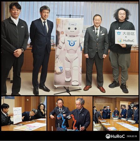 2026年2月19日、人とロボットが共生する未来を創造する共創プラットフォーム「HuRoC (Human-Robot Commons)」の実行委員会メンバーが、大田区の鈴木晶雅区長および川野正博副区長を表敬訪問しました。