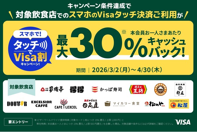 最大30%キャッシュバック!スマホで!タッチでVisa割キャンペーン!全国の対象飲食店舗がお得に♪