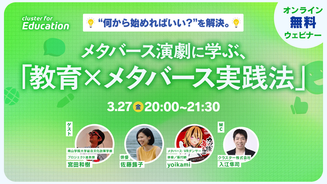 日本最大級のメタバースプラットフォーム「cluster」を運営するクラスター株式会社(本社:東京都渋谷区、代表取締役CEO:加藤直人、以下「クラスター」)は、2026年3月27日(金)20:00より、教育関係者向けオンライン無料ウェビナーの第3回を開催いたします。
