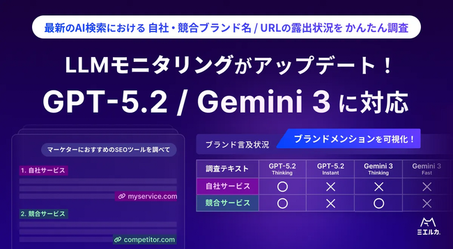ミエルカSEO・ミエルカGEO、「LLMモニタリング」機能がGPT-5.2 / Gemini 3 に対応