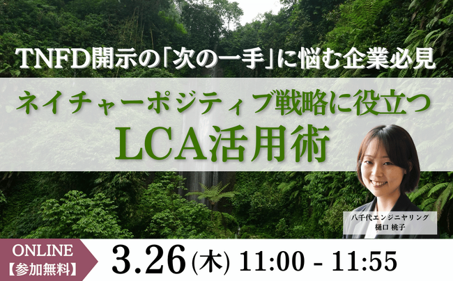 八千代エンジニヤリング株式会社(本店:東京都台東区、代表取締役社長執行役員:高橋 努)は、無料オンラインセミナー「【TNFD開示の「次の一手」に悩む企業必見】ネイチャーポジティブ戦略に役立つLCA活用術」を3月26日(木)に開催します。