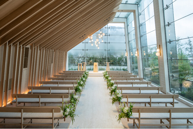 祭壇奥と壁面のガラス窓からたっぷりと日差しが差し込み、豊かな緑と青空を楽しめるチャペルは、表参道のケヤキ並木をイメージしたナチュラルウッドのデザインが特長的。緑のぬくもりと太陽の光で満たされた空間は、つかの間ここが都心であることを忘れ、おふたりもゲストも自然体で時間を過ごせる開放感あふれるチャペルです。