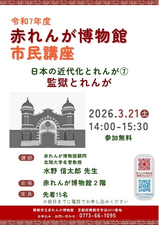 舞鶴市は、令和8年3月21日(土)に赤れんが博物館にて、シリーズ第7回目となる市民講座「監獄とれんが」を開催します 。講師に同館顧問の水野信太郎さんを迎え、赤れんが建造物の歴史と魅力を解説します。