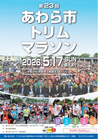 2026年5月17日(日)に「第23回 あわら市トリムマラソン」を開催します。会場はあわら市役所。2km・3km・5km・10kmのレースから、親子で参加できる1.5km、誰でも気軽に参加できるスマイルランまで、幅広い世代が楽しめる全24部門を用意しています。