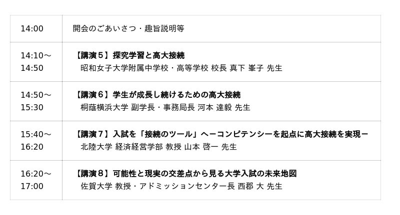 少子化や大学全入化、国際社会の変容、AIの進化など社会の変化を背景に、高大接続のあり方について議論が進むなか、各領域の最前線で活躍される方の識見は、自校の高大接続のあり方を考える大学・高校の教職員の皆様に大きなヒントとなるものです。オンライン開催ですので、全国から参加いただけます。この機会をぜひ貴媒体にてご紹介ください。