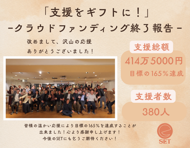 380人の応援が、次の挑戦者へ。支援が「ギフト」になるSET15周年の日にクラウドファンディングが414万円、達成率165%で終了