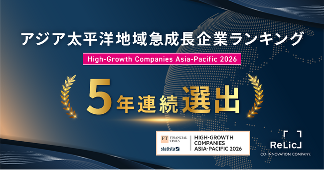 事業共創カンパニーである株式会社Relic(本社:東京都渋谷区、代表取締役CEO:北嶋貴朗、以下Relic)は、英・Financial Times社と独・Statista社が共同で実施する「FT ranking: High-Growth Companies Asia-Pacific 2026(アジア太平洋地域における急成長企業ランキング2026)」に、5年連続で選出されたことをお知らせします。