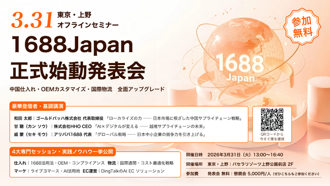 これを記念し、2026年3月31日(火)に東京・上野にて「日中クロスボーダー仕入れ新トレンドセミナー」を無料開催いたします。アリババ1688の代表をはじめ、日中越境ビジネスの第一線で活躍する全7名の専門家が登壇し、仕入れ・物流・マーケティング・EC運営の4領域にわたる実践的なセッションをお届けします。