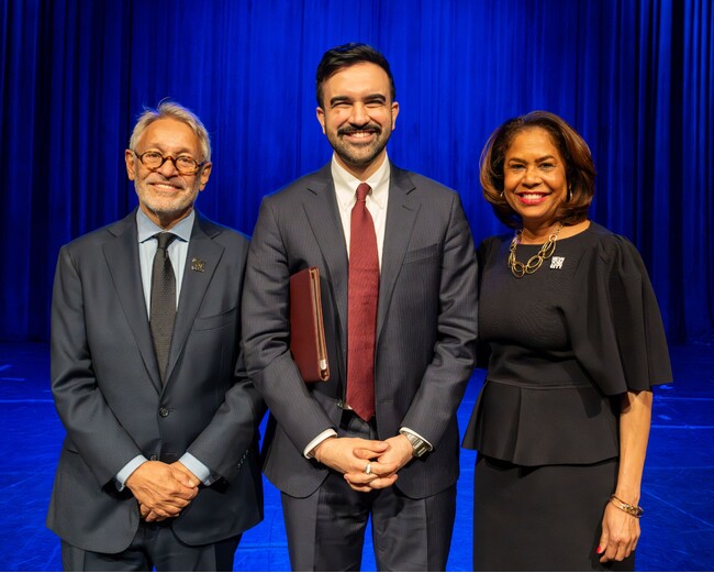 ゾーラン・マムダニ市長を中心に、右にニューヨーク市観光会議局プレジデント兼CEOのジュリー・コーカー、左に理事長のチャールズ・フラットマン氏 Photo: Matthew PAPA