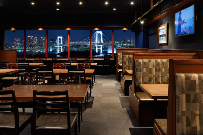お台場店は2000年4月1日に人気の観光エリア・お台場にある「アクアシティお台場」の6階にオープンいたしました。店内は船室や港の酒場をモチーフにした内装を施しており、落ち着いた雰囲気でゆったりとお食事をお楽しみ頂けます。また、特筆すべきは窓から見えるまるで宝石のような「抜群の景色」。レインボーブリッジ・東京タワー・東京湾が一望出来、昼夜を問わず素晴らしい光景が広がります。特にカウンター席から見る景色は圧巻で、カップルのお客様を中心に人気のお席となっております。