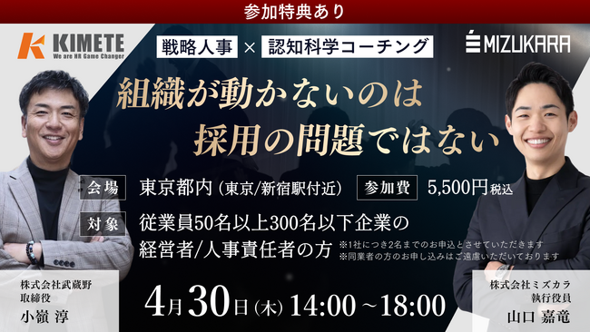 認知科学に基づくコーチングを法人・個人に提供する株式会社ミズカラ(本社:東京都千代田区、代表取締役 山宮健太朗)は、2026年4月30日(木)に中小企業の経営支援を行う株式会社武蔵野(本社:東京都小金井市)と共催セミナーを開催いたします。