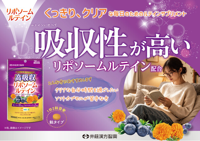 井藤漢方製薬株式会社(本社:大阪府東大阪市、代表取締役社長:井藤竜生)は、高吸収*のリポソーム型ルテインを配合した、粒タイプのサプリメント【リポソームルテイン】を、2026年4月6日(月)より発売いたします。