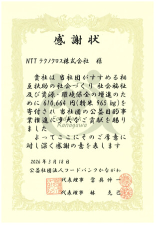 NTTテクノクロス株式会社(本社:東京都港区、代表取締役社長:岡敦子、以下「NTTテクノクロス」)は、健康維持・増進施策「ウォーキングイベント」(2025年10月実施)の参加社員の総歩数に応じた金額610,664円(精米965kg相当)を、地域福祉への貢献として、公益社団法人フードバンクかながわ(神奈川県横浜市)に寄付しました。