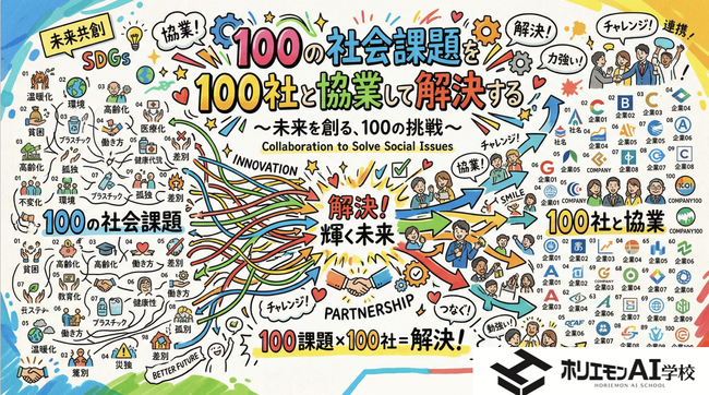 企業向けAI研修・コンサルティングを手掛けるホリエモンAI学校株式会社(本社:東京都新宿区、代表取締役社長:荒木 賢二郎、以下「ホリエモンAI学校」)は、ホリエモンAI学校、ホリエモンAI丸投げ、ホリエモンAI選挙など、ホリエモンAI〇〇の名称にて、世の中の課題を解決する、「100人の経営者と100個のAI事業を作り100の社会課題を解決するプロジェクト(以下、「100プロジェクト」といいます)」を発表いたします。