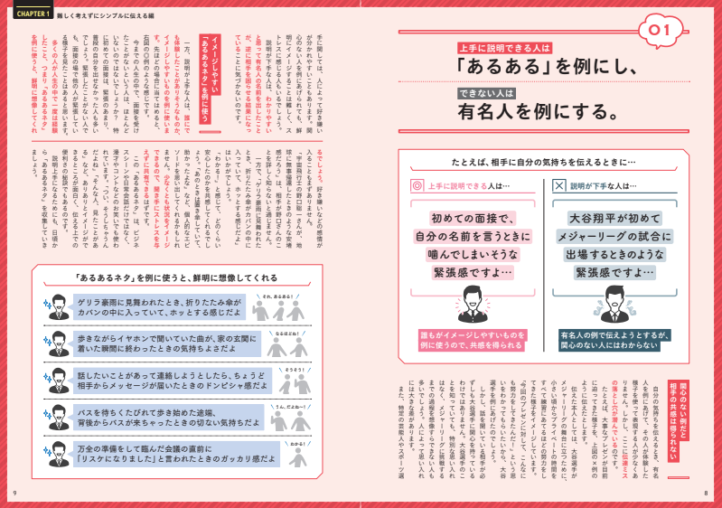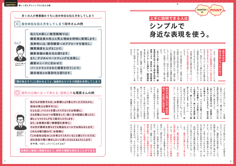 本書は各章で、巷にあふれている説明下手の具体例と、それをほんの少し意識するだけで劇的に改善する説明上手の伝え方の例を対比しながら紹介しています。