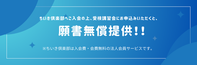 当研究所の法人会員サービス「ちいき倶楽部」へご入会(入会費・会費無料)の上、受検講習会にお申込みいただくと、期間限定で受検申込用紙(願書)を無料送付します。