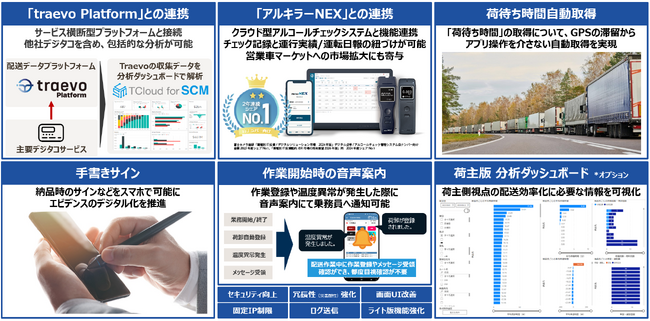 GPSを用いた荷待ち時間の自動取得や、納品時の手書きサインをスマートフォン経由で実施できるようになり、ドライバーの負荷をかけないデータ収集の強化を実現しました。また、作業開始時の音声案内による配送の品質向上や、荷主側視点での分析ダッシュボード(オプション)を追加しています。