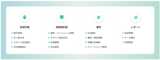 単なる事務代行(BPO)ではなく、エンジニア採用の要件定義やペルソナ設計、技術広報の打ち出しといった上流工程から、スカウト送信、日程調整、エージェント管理といった実行フェーズまでを一貫して代行します。