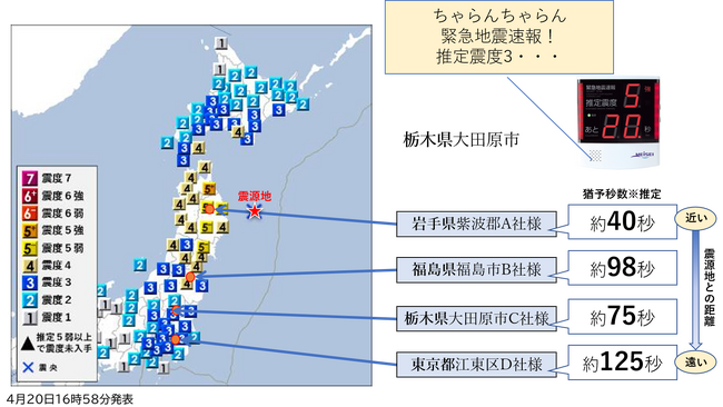 三陸沖を震源とする最大震度5強の地震(4月20日16:53頃発生)について、『ProP biz(プロップビズ)緊急地震速報配信サービス』の配信状況をお知らせいたします。