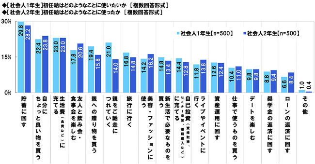 次に、社会人2年生(500名)に、初任給はどのようなことに使ったか聞いたところ、「貯蓄に回す」(28.2%)が最も高くなり、「自分にちょっと良い物を買う」(23.8%)、「生活費(食費など)に充てる」(23.0%)、「友人と飲み会・食事会を楽しむ」(20.6%)、「美容・ファッションに使う」(16.2%)が続きました。