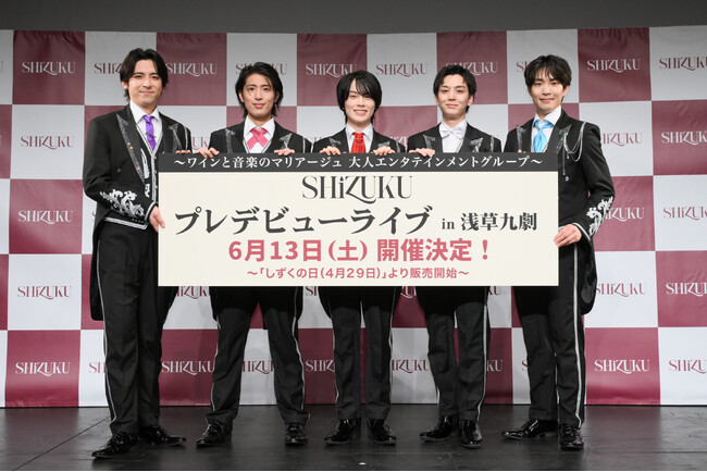 株式会社レプロエンタテインメント(所在地:東京都千代田区、代表取締役社長:本間憲、以下、弊社)は、株式会社つばさレコーズと共同で、ワインがコンセプトの新グループ「SHiZUKU」を結成しました。2026年4月20日(月)に、浅草九劇で行われたグループお披露目会には、「ワインがテーマの男性ボーカルグループオーディション」から選ばれた5名のメンバーが登壇しました。