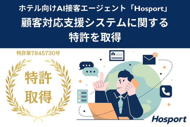 株式会社ホスポート(本社:東京都港区北青山、代表取締役:西原宗一郎)は、宿泊施設における顧客対応業務を支援する技術に関して、特許第7845730号「顧客対応支援システムおよび顧客対応支援方法」を取得したことをお知らせします。登録日は2026年4月6日、特許公報発行日は2026年4月14日です。