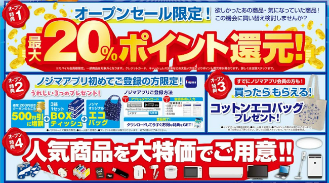 また、4月24日(金)~5月15日(金)の期間中、オープン限定特価としてノジマポイントが最大20%還元になるお得なセールも開催いたします。皆さまのご来店をお待ちしております!
