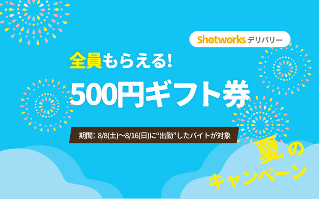 夏休みのデリバリーバイトキャンペーンを『ショットワークスデリバリー』ユーザー向けに実施<8/8(土)~8/16(日)の勤務バイトに対して500円ギフト券を配布>