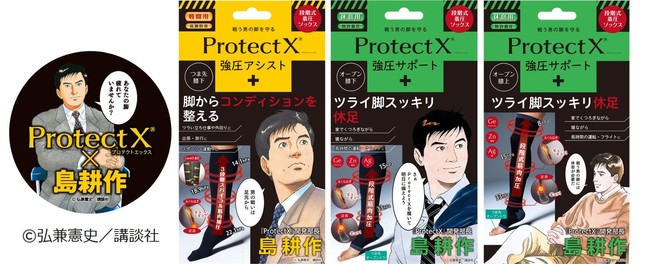 『Protect X』は、男性専用の着圧ソックスブランドとして、2018年9月の販売開始以来、脚に悩みを抱える多くの男性から好評をいただいています。本コラボレーションは、ビジネス界の戦う男代表格ともいえる『島耕作』が開発部長として世の中の男性の脚の悩みを着圧ソックスで解決するというストーリーを通じ、Protect Xの利用シーンや段階式着圧ソックスの特性を理解していただきながら、脚の疲れを感じながらも頑張り続けてしまうビジネスマンをサポートしていくことを目的としています。