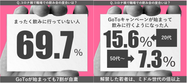 1.いまだに約7割が職場の飲み会に行っていない。GoToで解禁した人も若者中心に約1割にとどまる