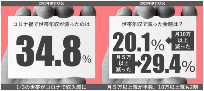 1.2020年、コロナで世帯年収が減少したと回答した主婦は34.8% 1/3の世帯がコロナで収入減に