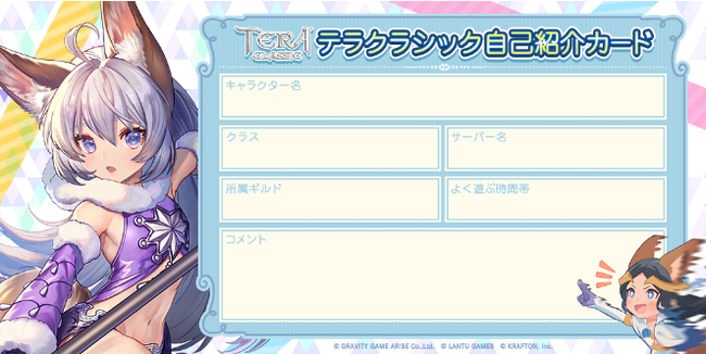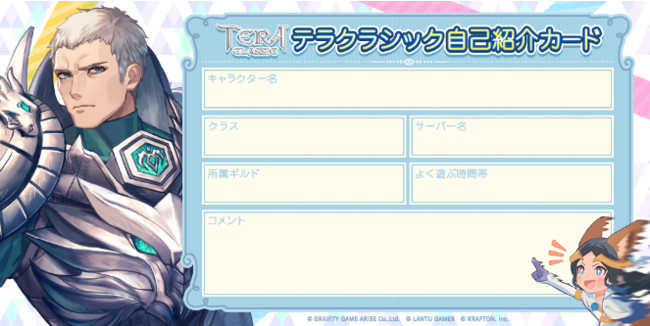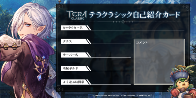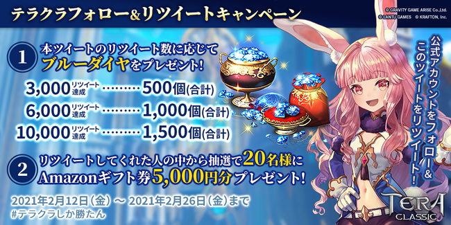 グラビティゲームアライズ株式会社(所在地:東京都中央区)は、新作オンラインRPG『テラクラシック(英語表記:TERA CLASSIC、通称:テラクラ)』において、本日2月12日(金)よりゲーム内アイテムや総額10万円のAmazonギフト券が当たる公式Twitterフォロー&リツイートキャンペーンを開催いたします。また、期間限定イベントやオリジナル自己紹介カードの配布も開始したことをお知らせいたします。