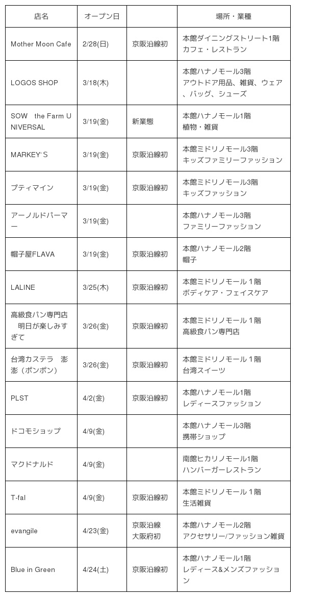 さらに神戸の老舗カフェ「Mother Moon Cafe」が京阪沿線に初出店する他、好感度なキッズファッションが揃う「MARKEY‘S」や「プティマイン」などが新たに出店します。
