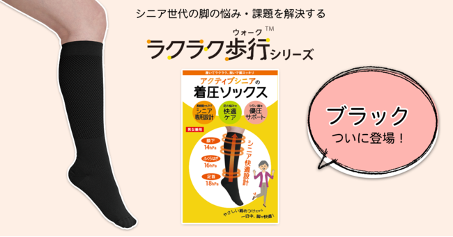 シニア専用の着圧ソックスとして好評をいただいている「アクティブシニアの着圧ソックス」に、新色ブラックが登場です。これまではベージュのみの展開でしたが、黒色のシニア向け着圧ソックスが欲しいというお客様からのお声を多くいただき、ブラックカラーを新たに販売することを決定いたしました。