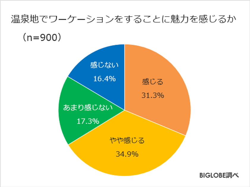 全国の20代から50代のリモートワークが可能な企業に勤める会社員900人に「温泉地でワーケーションをすることに魅力を感じるか」を質問したところ、「感じる」(31.3%)、「やや感じる」(34.9%)と7割弱が温泉地でのワーケーションに魅力を感じていることが明らかとなった。