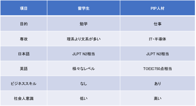 高度な専門知識や技術を有している「高度外国人材」は、これからの日本に必要不可欠で、政府からも様々な分野での活躍が期待されています。「PIP人材」は日本語能力のみでなく日本で働くために必要なビジネススキルや社会人意識を習得しています。既に高度外国人材としての条件を満たすPIP人材が日本で活躍しています。これからもPIPプログラムで日本のIT業界の未来を担う高度外国人材の卵を育成していきます。