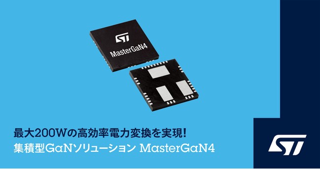 STマイクロエレクトロニクス(NYSE:STM、以下ST)は、シリコン・ベースのハーフブリッジ・ゲート・ドライバと、2つのGaN(窒化ガリウム)パワー・トラジスタを集積した世界初のシステム・イン・パッケージ(SiP)「MasterGaN(R)」の新製品「MasterGaN4」を発表しました。同製品は、225mΩのオン抵抗(RDS(on))を持つ2つの対称型650V耐圧GaN(窒化ガリウム)パワー・トランジスタ、ゲート・ドライバ、および保護回路を集積し、最大200Wの高効率電力変換アプリケーションの設計を簡略化します。